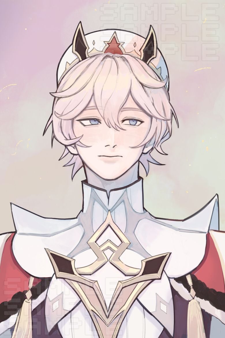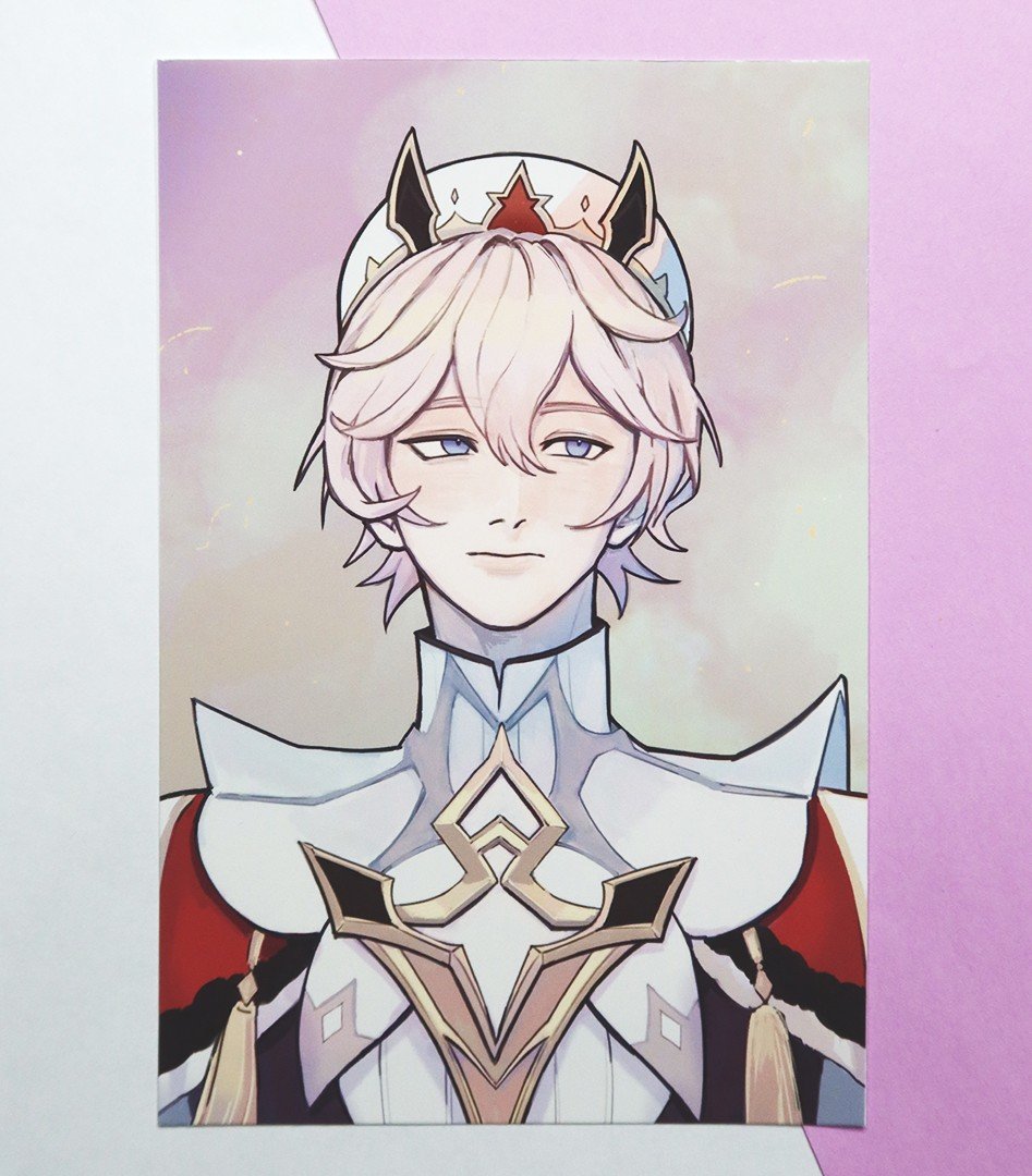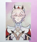 Features Dahlia from Genshin Impact with a celestial sunset background